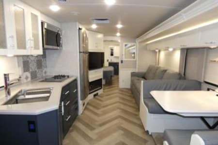 The 2025 Winnebago Adventurer 35F is a 35' 10" Class A gas motorhome, built on the Ford F53 chassis and powered by a 7.3L V8 engine. It comfortably sleeps five and includes a variety of features for comfortable living and convenient travel, including a full and half.