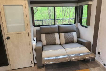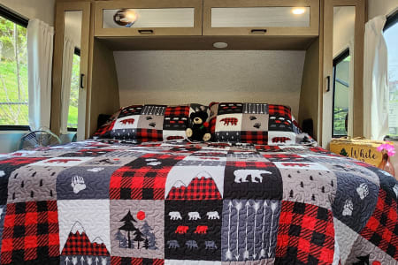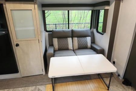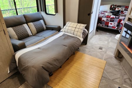 Camper includes a private Versa-Tilt (adjustable) king size bed, twin size folding cot w/pad and reclining sofa (Great for the kids). There is a bar top dining area with huge windows to take in all of the views, folding table for games and activities for the sofa, heated fireplace that can be available in the living space and the bedroom, and a massive open concept great room and kitchen just like a large 5th wheel layout. Don't worry about towing, setup or breakdown yourself. We will setup & breakdown everything for you and you can sit back and watch us back up the trailer. We provide as many amenities as possible that can fit in our camper. We do allow 2 Pets for FREE, but please keep bed and sofa covered and clean up all accidents. *No Smoking Allowed inside or near the camper and keep all windows and door closed while using a campfire.
