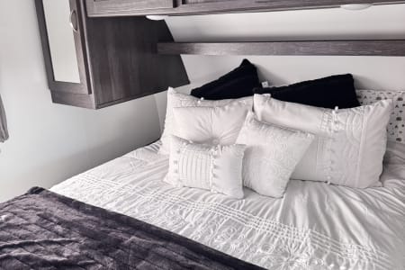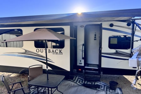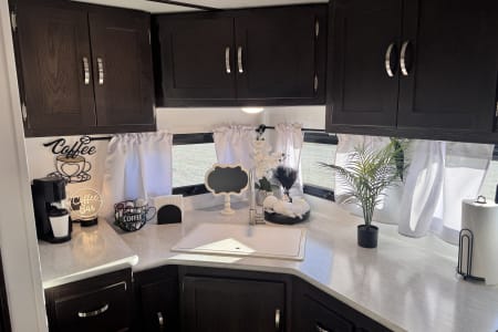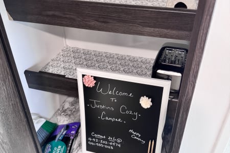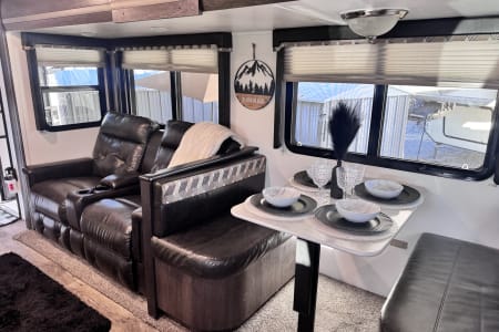 Upgraded Cute and cozy camper for your all around vacation needs. Modern upgrades with everything needed for your next adventure. The dinner table folds into a small bed suitable for children with 2 very comfortable recliners, and a new queen size mattress. You can probably sleep 6 with children. The layout is very open and simple with a good floor plan, bedroom closes off to living quarters if wanted. I'm happy to help with any questions or needs, the trailer is also very easy to tow and setup or I'd be happy to deliver.