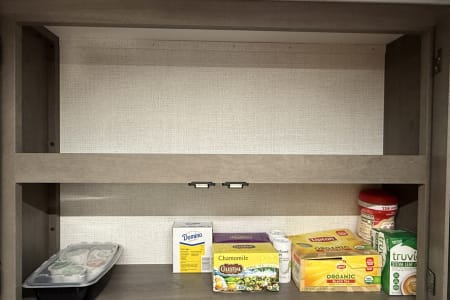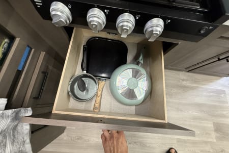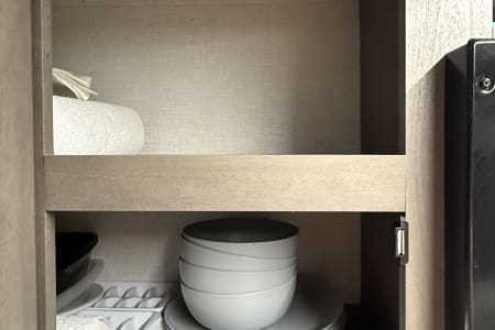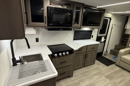 Fully Equipped Kitchen – Cook your favorite meals on the road with a three-burner stove, oven, microwave, fridge/freezer, and plenty of counter space.