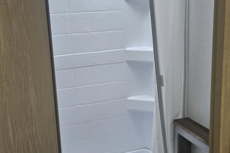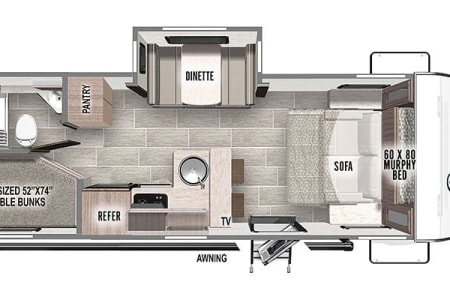 This cozy home-on-wheels comfortably sleeps the whole family with a queen-size bed, a double-sized bunk bed, and a convertible dinette bed. Whip up delicious meals in the fully functional kitchen and refresh in the convenient bathroom.