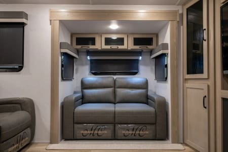 • A roomy rear living area with dual recliners, two plush sofas (convertible to a bed), TV and electric fireplace.