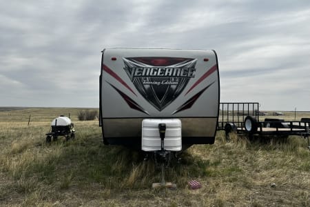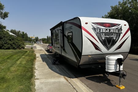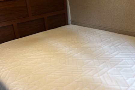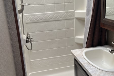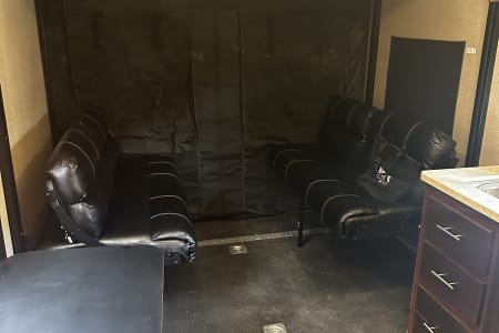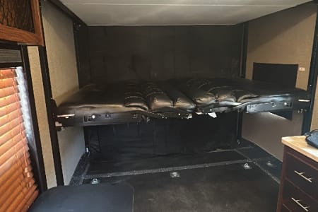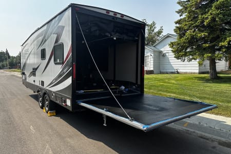 This camper has a separated bedroom, fold out couches that turn into bed and an electric lower and raise full bed. It has air conditioning, heater, and Hot water. Electric hitch jack. 4 leveling jacks. The ramp for the toys turns into a deck if needed. Full bath and kitchen with sink. Has an outdoor shower hose if needed.
