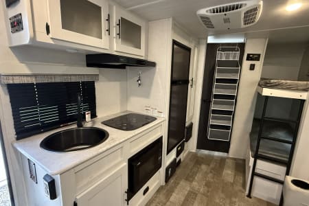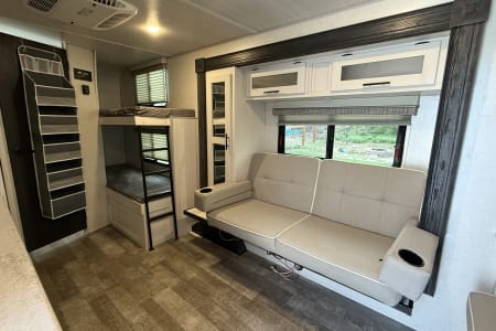 Inside, enjoy a versatile Murphy bed that tucks away to create extra space, a slide-out with a roomy dinette, and bunk beds the kids will love. The fully equipped kitchen includes a two-burner stove, convection microwave, fridge/freezer, and deep sink—ready for anything from morning pancakes to s’mores prep.