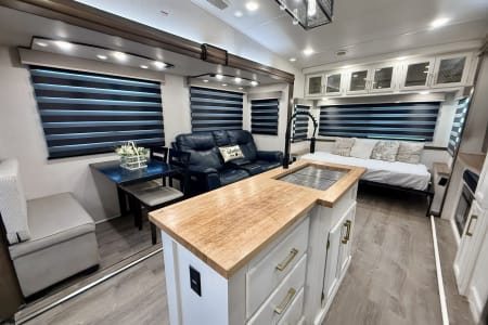 Rear Living Area: Theater seating, hide‑a‑bed sofa, booth dinette, and large LED TV—great for relaxing or hosting.