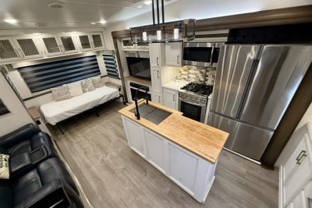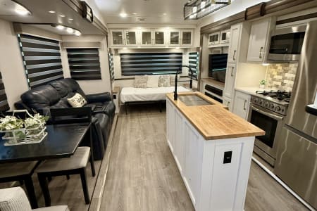 The 2022 Prime Time Crusader 382MBH is a spacious fifth-wheel bunkhouse, stretching roughly 43' in length with four slide-outs. It's designed to sleep 7 guests.