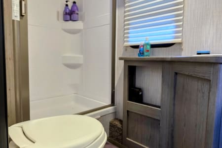 No "roughing it" here! Your private bathroom includes a spacious shower with a skylight, a toilet, and a vanity with a sink.