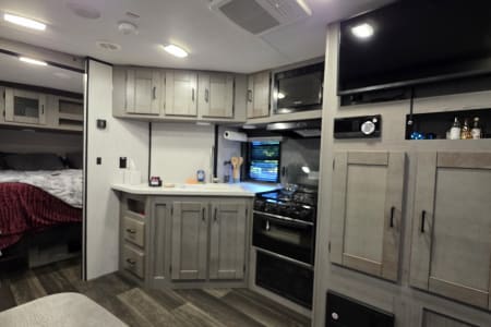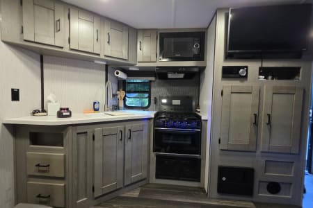 Features a large refrigerator, 3-burner stove, oven, and microwave.
