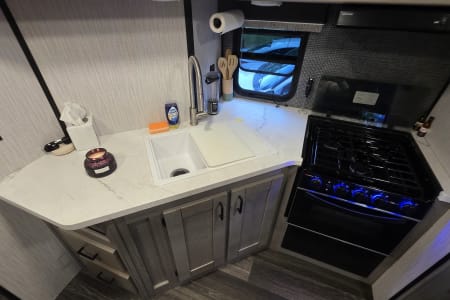 Includes a gas BBQ, sink, and mini-fridge under a large power awning with LED lighting.