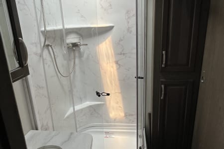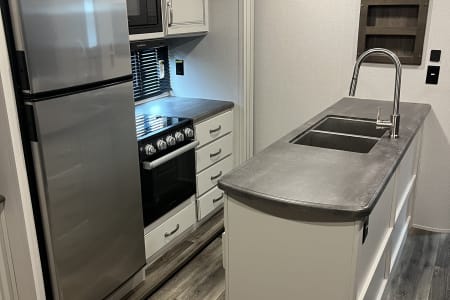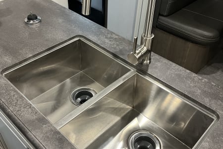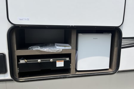 And the fun doesn’t stop inside. Outside, enjoy outdoor cooking with a built-in grill and mini fridge, plus a convenient hose attachment for easy clean-up or rinsing off after a day outdoors.