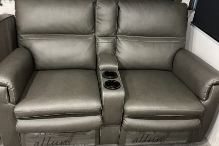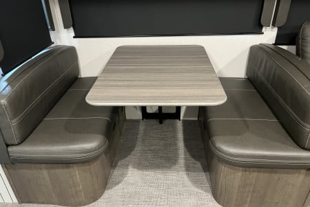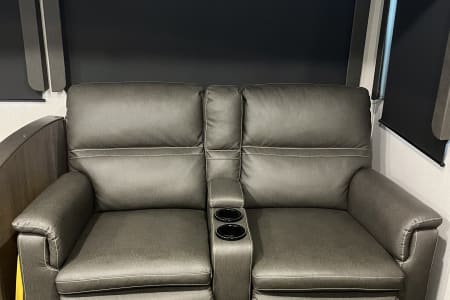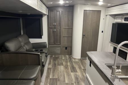 Inside, you’ll find a private master bedroom for some well-earned peace and quiet, a full bathroom with a stand-up shower, and a fully equipped kitchen that includes a refrigerator, stove, microwave, and even a kitchen island for extra prep space. The dining table converts into an additional bed, and the living area features two heated, reclining chairs plus a 42-inch TV for cozy movie nights.