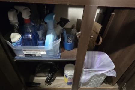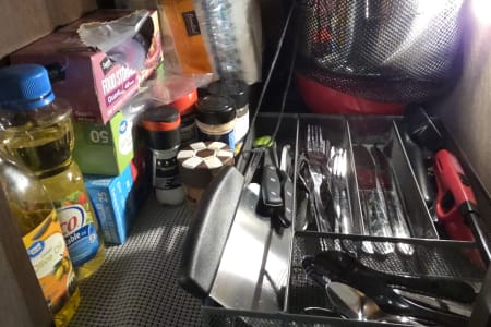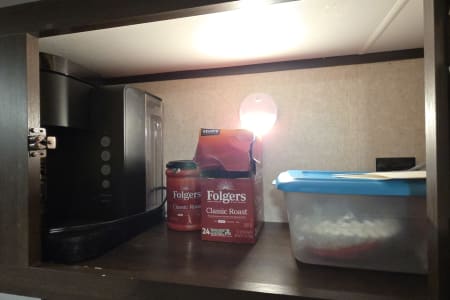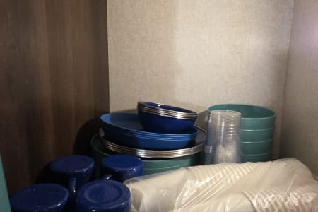 Inside - will be a Keurig and a 12-cup coffee maker. Pots, Pans, Utensils, plates, cups, and seasonings.