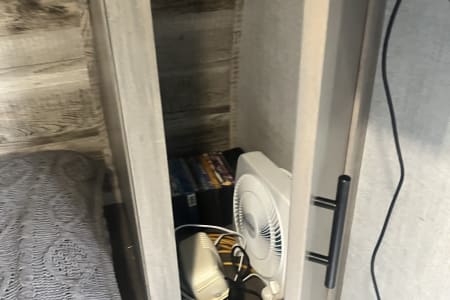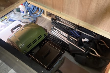 There Maybe more fun stuff in there just look around we made sure there is a small space heater that can help the gas heater or use the available extension cord and run it out to the back of your SUV there is a full sized air mattress in the storage area that can turn the back of your SUV into another bed in case your brother in law tags along lol there is also a little fan.