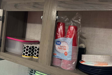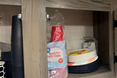 There are 10 plastic bowls cups and plates along with paper plates and red solo cups coffee cups forks and assorted utensils aluminum foil zip lock bags paper towels and Tupperware