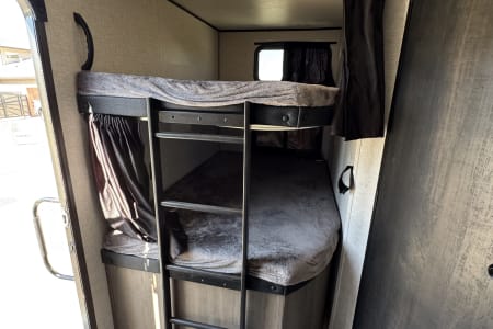 Beds: Double-over-double bunk beds, a queen bed in the front bedroom, and a convertible U-shaped dinette.