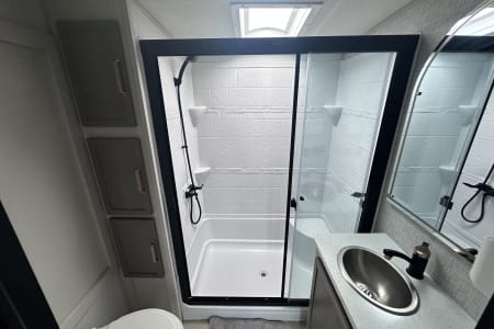 This camper is the perfect home-on-wheels for everyone! With plenty of space, lots of windows for natural lighting, a bathroom with a hot shower and fully equipped kitchen, it has everything you will need for your getaway.