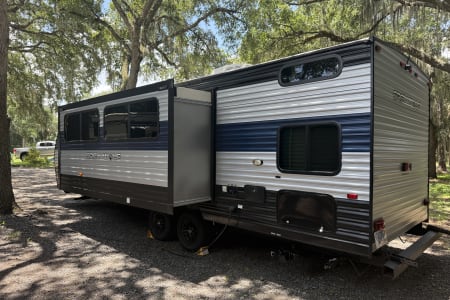 Enjoy modern amenities like A/C, indoor/outdoor Bluetooth speakers, power awning, and more—great for families or groups.