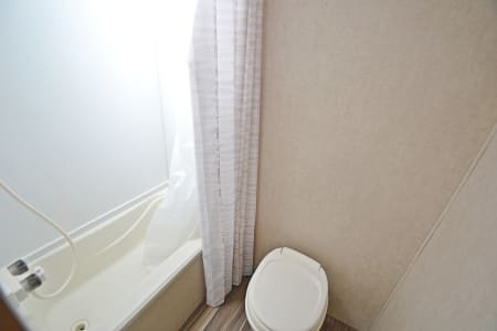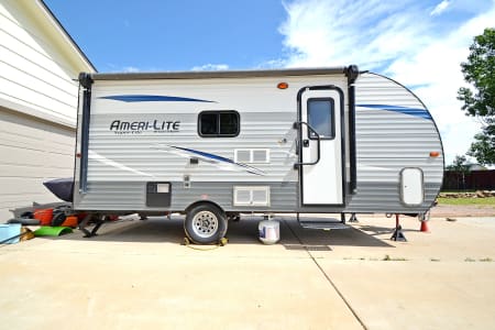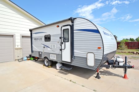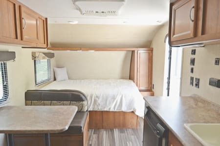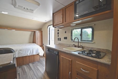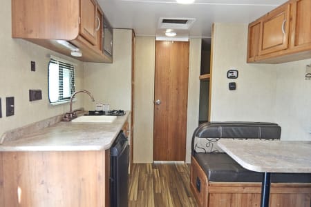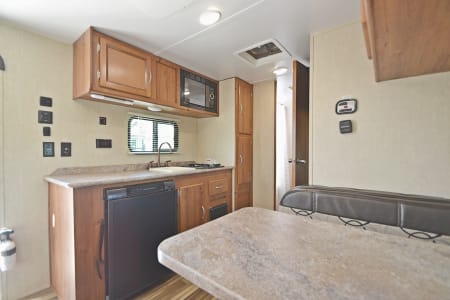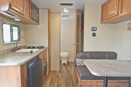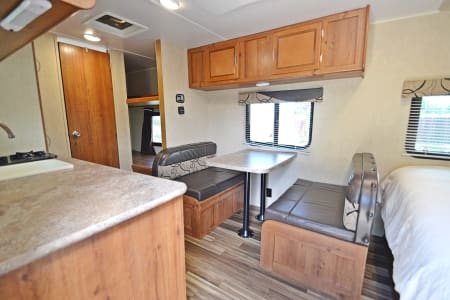 Perfect for your next family adventure, this cozy and well-equipped RV comfortably sleeps two adults and two kids, with room to spare! Enjoy a plush queen bed, twin bunk beds, and a convertible dinette that offers an additional sleeping space. Inside, you'll find a fully stocked kitchen with a stove, microwave, refrigerator, and plenty of cabinet and storage space. The bathroom includes a toilet and a shower with both hot and cold water, making it easy to freshen up after a day of fun. Stay comfortable year-round with built-in heating and air conditioning, and enjoy meals or shade outdoors under the convenient awning. Leveling jacks are provided for a smooth and stable setup at your campsite. Pet friendly—because the whole family deserves to come along! Whether you're hitting the road for a weekend escape or a longer getaway, this RV is ready to help you make lasting memories.