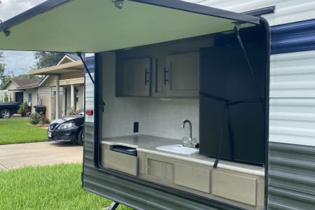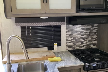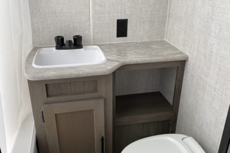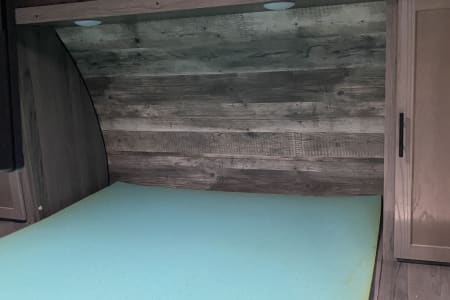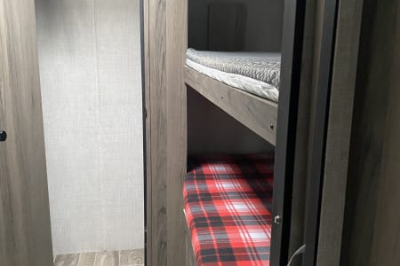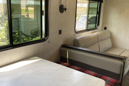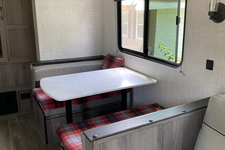 This cozy Dreamer will comfortably sleep up to 6 guests with a private queen bed, twin bunk beds and a separate twin bed. It's perfect for families or small groups. Enjoy a full bathroom with a shower and tub combo, ideal for relaxing after a long day or for bathing your little ones. The fully equipped kitchen includes a stove, microwave, sink and fridge. Sit down and enjoy the dinette table, which is perfect for a meal, snack, games or for planning your next adventure.