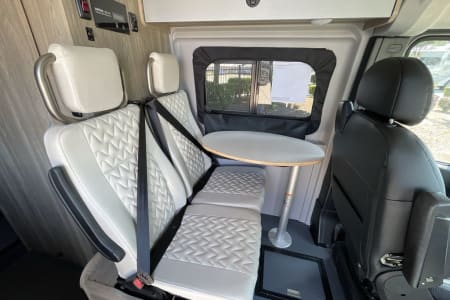 Behind the two Swivel enabled captain's seats are two additional seats (car seat-friendly). The removable table makes a perfect spot for meals and activities, and both front seats swivel to create a cozy dining nook.