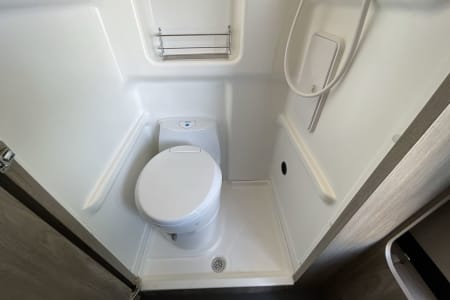 A wet bath with a mirror, a hot-water shower, and a cassette toilet that’s super easy to empty—no hookups needed!
