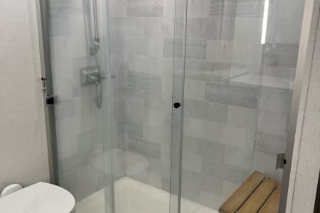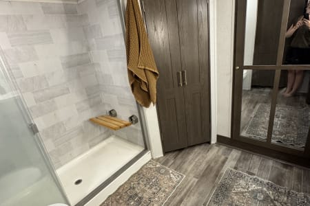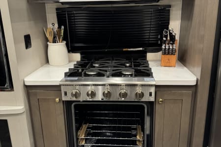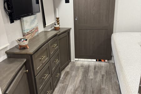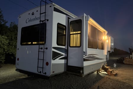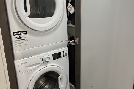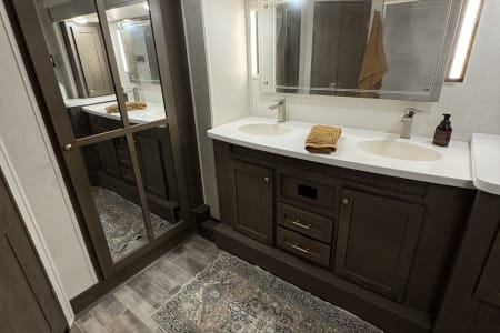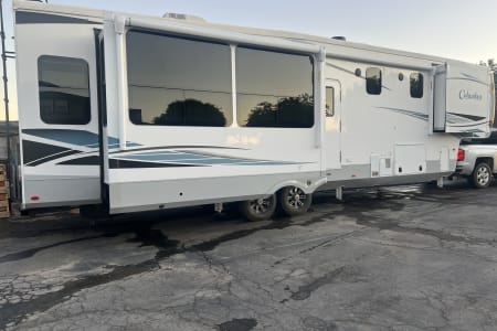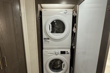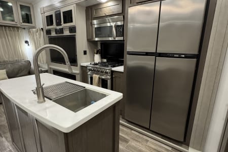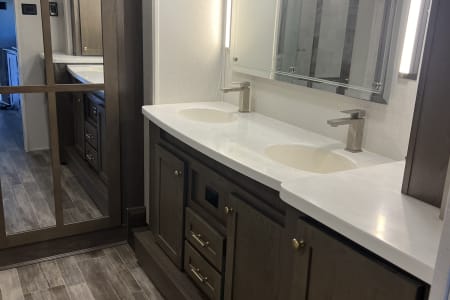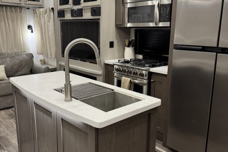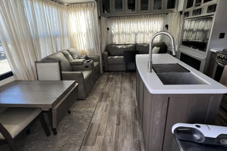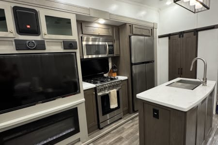 This is a couples dream fifth wheel with a master suite that offers a king bed slide out, an entertainment center and storage, plus a sliding door into the large front bathroom complete with a two sink vanity, a seated shower, and a walk-in closet. There is a washer & dryer . You will enjoy the main living and kitchen area with dual opposing slides, a kitchen island, You will also find residential appliances, and lots of seating from the split tri-fold, the power theater seats and the free standing table with chairs.
