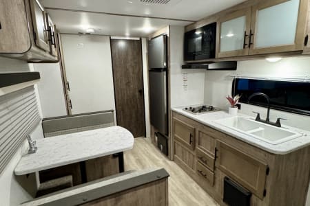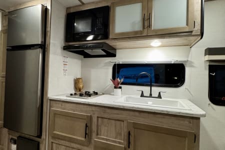 This cozy camper sleeps 4 adults or 2 adults with 4 kids (depending on how much you like each other). Comes stocked with kitchen essentials, chairs, bedding, and toiletries – just bring your snacks and your sense of adventure.