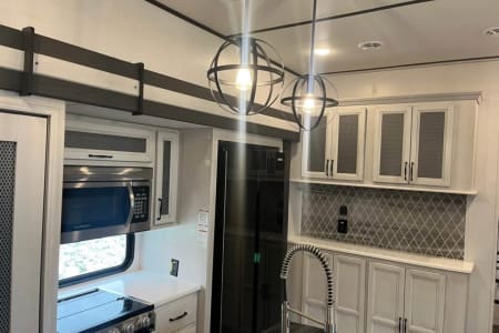 This fifth wheel comes with a full king sized bed in the master bedroom, and with a washer and dryer.