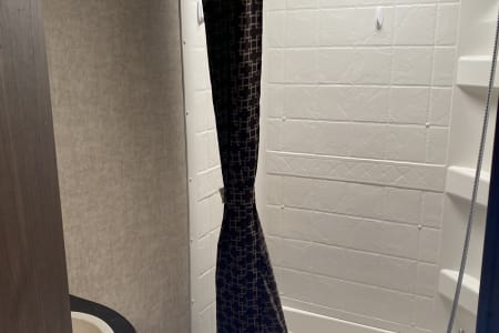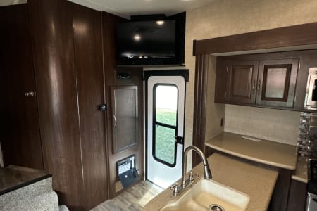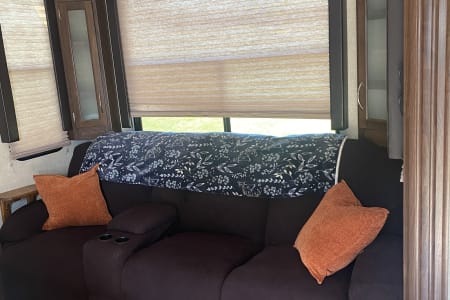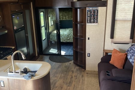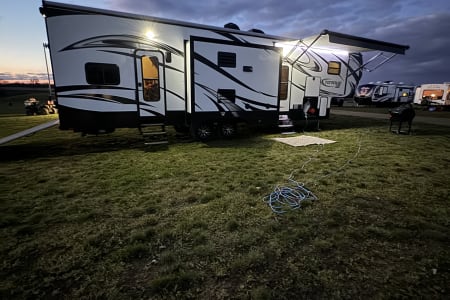 Our rig is a 2015 Heartland Torque fifth wheel toy hauler. Perfect for couples or families looking to make core memories for years to come. Comfortable and cozy with a queen-sized bed that includes a pillow-top mattress pad in the master bedroom. The master also has its own 40 inch tv. There is a full bath with a ceramic toilet and shower with a shower hose in the main living area. The kitchen has a large open floor plan that includes a Keurig, microwave, freezer, fridge, gas stovetop, and oven. Along with a very large pantry to fit all your food and goodies while camping. In the living room, there is a reclining couch and a 55 inch tv. The 10-ft garage can fit all your toys you want to take along with you. It can easily fit two dirt bikes and a golf cart with room for tools, etc., for example. It has the Happijac bed lifts. Which can be a two-hunk with two couches below or fold the couches down, and it converts to two full-size bunk beds. The garage has a half bath of its very own. There is also another 40-inch smart tv in the garage. There is a sliding glass door with a screen as well, that can make the back garage its very own bedroom if needed for privacy. Indoor and outdoor speakers ensure that you can relax to your favorite camping playlist no matter where you are. The LED light strip below the electric awning provides plenty of lighting for relaxing when the sun goes down. There is also another electric awning over the back of the toy hauler as well for extra shade.