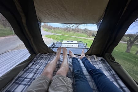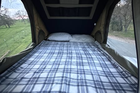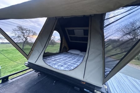 Pop-up tent on top makes for easy set up for sleeping.