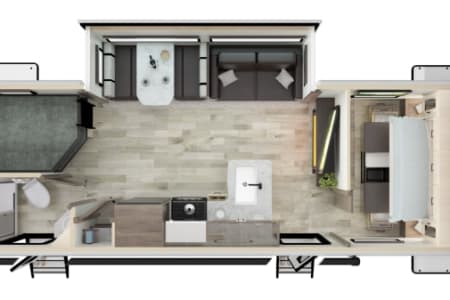 31’ TRAILER WHICH INCLUDES A SEPARATE DOOR FOR THE BATHROOM SO IT CAN BE ACCESSED FROM OUTDOORS.