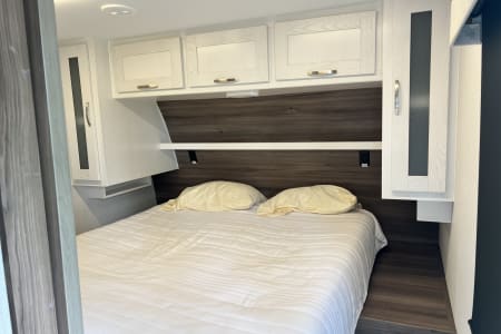 PANTRY IN KITCHEN, STORAGE UNDER BUNKS, FULL BATHROOM INCLUDING NICE-SIZED SHOWER FOR TALL PEOPLE. RECLINING COACH CHAIRS AND SWIVEL WALL-MOUNTED SMART TELEVISION IN ADDITION TO ELECTRIC FIREPLACE. SPACIOUS REFRIGERATOR AND FREEZER, GAS BURNER RANGE AND OVEN. NICE DOUBLE SINK IN KITCHEN AND SOLID SURFACE COUNTERTOPS.