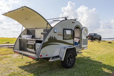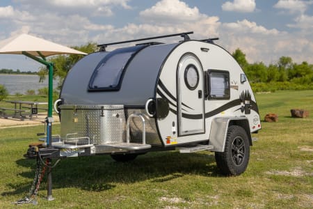 nuCamp TAG XL Boondock. A super lightweight teardrop travel trailer that can be towed with just about anything. Weight is just 1600 lbs. Somewhat offroad capable. Sleeps two adults comfortably. Comes with kitchen equipment, bedding and two camping chairs. 8 gallon water tank, a/c and heater (needs 110V). Can provide a gasoline generator for surcharge. Trailer hitch is included as well, you just need to provide the towing vehicle. Everything is keyless with code padlocks and keyless door lock. Can be picked up from a storage unit in Grapevine 6am-10pm with the provided code.