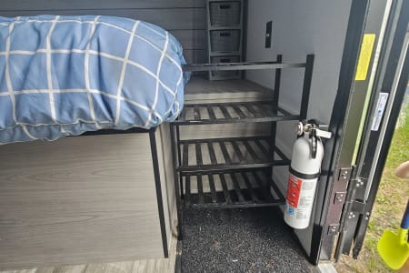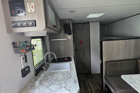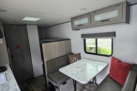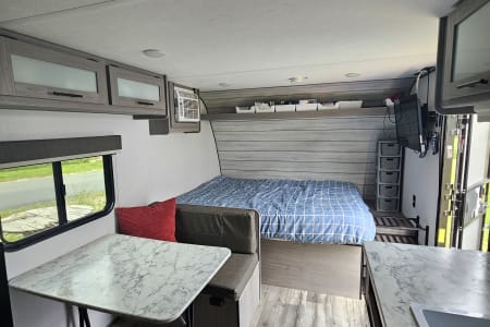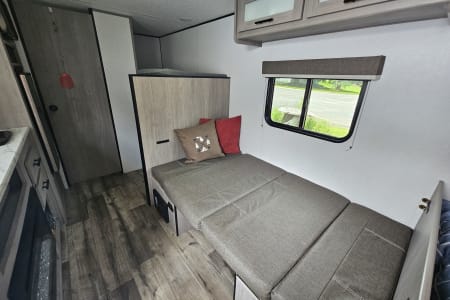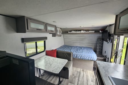 • Sleeps up to 5 – Queen bed, bunk beds, and convertible dinette