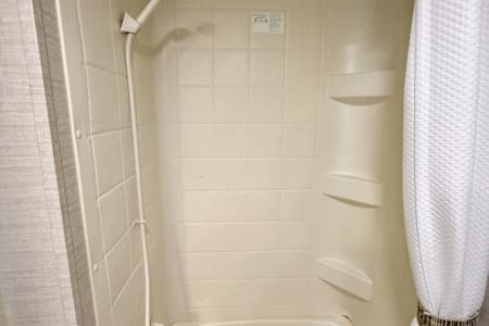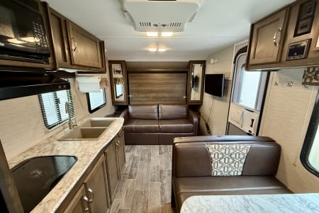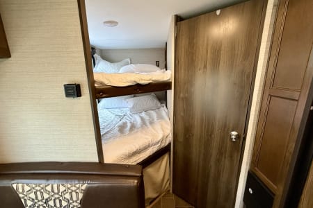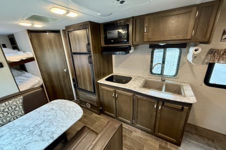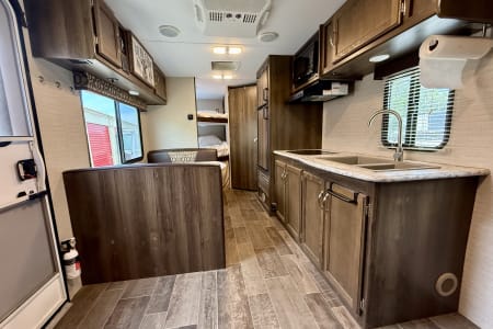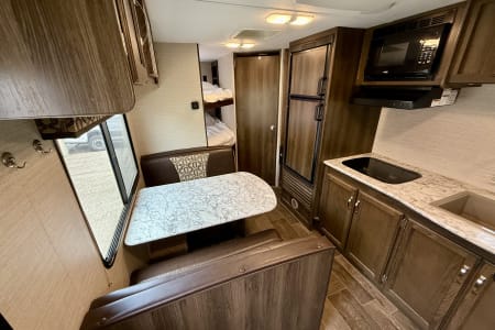 Inside, you’ll find a private queen bed up front, double bunk beds in the back, a convertible dinette, and a jackknife sofa—comfortably sleeping up to 8. The full bathroom includes a tub/shower combo, and the kitchen is equipped with a 2-burner stove, microwave, fridge, and plenty of storage.