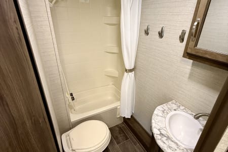 Outside, enjoy meals under the 15' power awning and make use of the large pass-through storage for all your gear. The unit also comes stocked with sewer and water hoses, leveling blocks, and everything you need to hook up at the campground.
