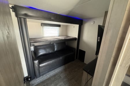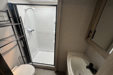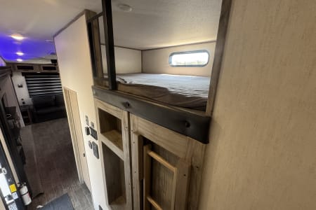 The primary bedroom features a king-sized bed, plenty of storage space, and a private bathroom with a residential shower. The mid-bedroom with loft is perfect for kids or guests, ensuring everyone has their own space to relax and unwind.