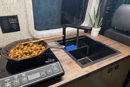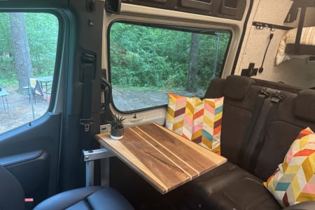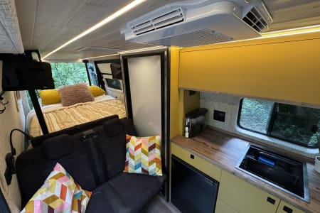 The kitchen area has a convection cooktop that stores away for more counter space, a nice sized sink and refrigerator, and lots of storage. The fronts seats swivel around and the back seats can move forward to create a cozy dining space for 4 with a reclaimed wood table top.