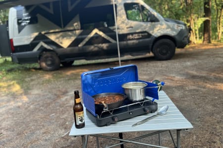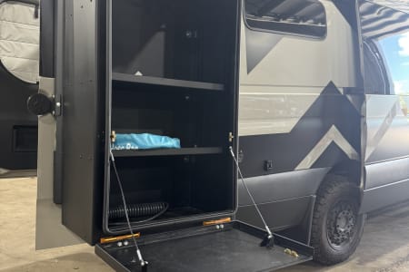 The lighted gear area under the lift bed has plenty of room for your gear and built-in L-Track to secure everything in place. It can also accommodate 4 bikes (ask for the bike mounts when renting) or bring your own 2" hitch mounted bike rack. Additional gear storage is provided in the locking exterior storage box mounted to the passenger side rear door. The van has a built-in air compressor with a quick-connect under the rear bumper and hoses and attachments to pump up your bike tires or stand-up paddle board.