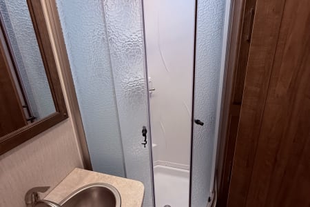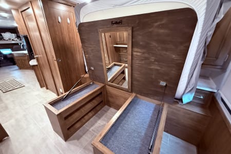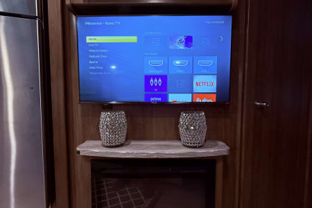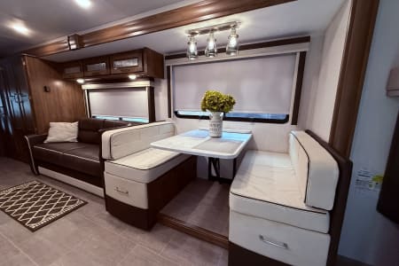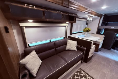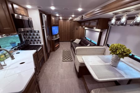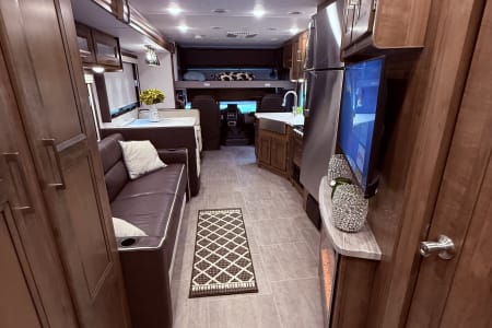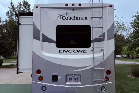 Our 35’ Coachmen Encore combines the comfort of a Class A RV with the driving length of a smaller rig. The rear back up and side view cameras enhance maneuverability and the overall driving experience. This RV is equipped with an outdoor kitchen, outdoor entertainment center, power dual awnings with lights and so much more! Inside our spacious RV you will enjoy a fireplace, smart TVs, a residential refrigerator, large farmer’s sink, washer and dryer, murphy bed with wardrobe mirror, memory foam mattress, power drop down cab bunk and so much more. This RV is fully equipped both inside and outside to include the following.