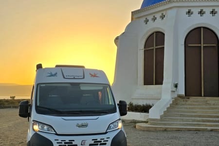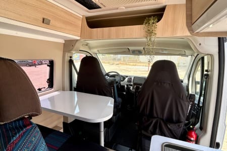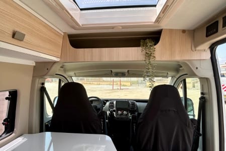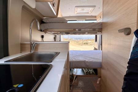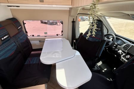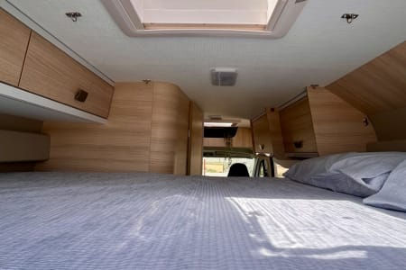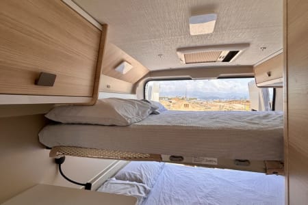 Camper diseñada para ofrecer confort y versatilidad. Motor FIAT 2.2 con 140 cv. Pueden viajar 4 personas y dormir 4 personas ya que dispone de dos camas de matrimonio en litera. Ambas camas son desmontables y ofrecen diferentes opciones, tanto si viajas en pareja como si lo haces en familia o si lo haces solo. Dispone de cocina equipada con 2 hornillos a gas, fregadero y nevera, así como una gran capacidad de almacenaje. El baño completo consta de lavabo, WC químico y ducha con agua caliente. Está equipada con una mesa en la zona de comedor donde pueden comer hasta 4 personas cómodamente gracias a sus asientos delanteros giratorios. La camper dispone de calefacción a gas en la zona de la vivienda. En la zona de la cabina tiene AA/CC y calefacción, pantalla multimedia táctil compatible con Apple Car Play y Android Auto, guantera refrigerada con capacidad para una botella de hasta 1,5 litros, varios conectores USB. Tiene de 3 tomas de enchufe a 220V disponibles cuando la camper está conectada a la red eléctrica, 1 en la zona de cocina, 1 en el baño y otra en la zona de comedor. Las ventanas de la camper y las 2 claraboyas están equipadas con mosquitera y oscurecedores. El acceso a la vivienda por la puerta lateral también dispone de mosquitera y un peldaño eléctrico que facilita la entrada.