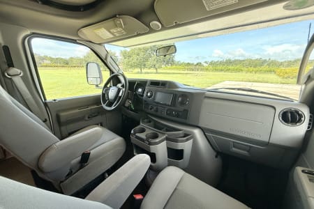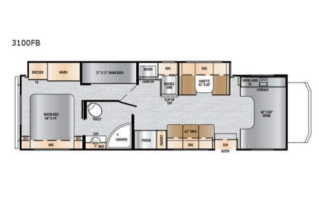 The 2024 East to West Entrada 3100FB is a Class C motorhome with a Ford E450 chassis and a 7.3L V8 engine producing 325 horsepower and 450 lb-ft of torque. It features a 6-speed TorqShift automatic transmission. The 3100FB floorplan includes a full-wall slide, bunk beds, and a master suite with a queen bed. It can sleep up to 10 people.