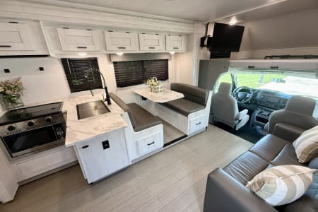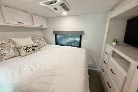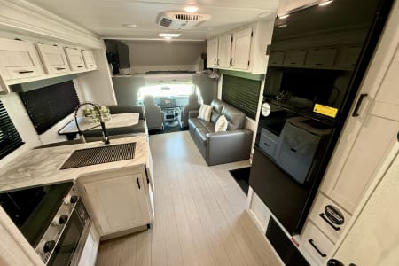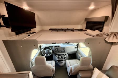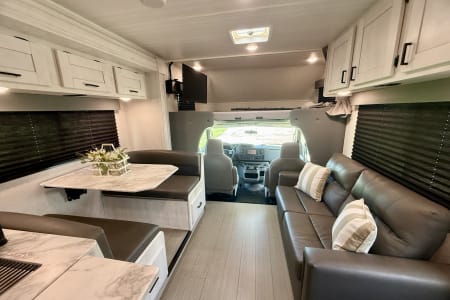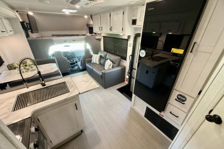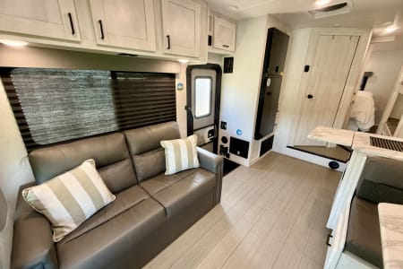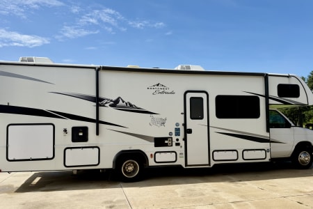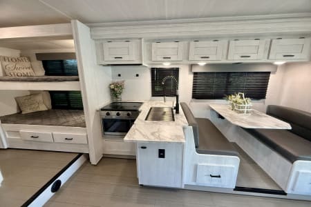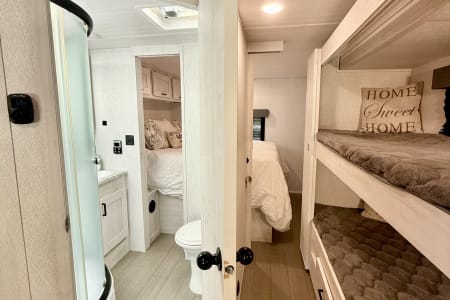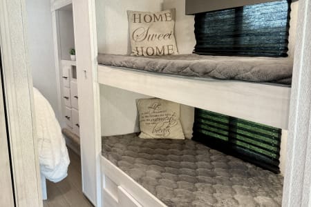 Features: Full-wall slide, bunk beds, master suite with queen bed, power awning with LED lights, backup and side view cameras, Winegard Air 360+ antenna, solar panel prep, and more.