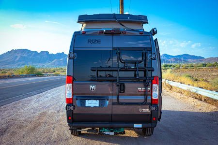 The van is powered by a built-in 190W solar panel and charge controller, allowing you to stay off-grid longer while keeping your devices and lights running. Outside, you’ll find a rear bike rack for two bicycles, an attachable rear water shower for a quick rinse, a motorized awning for shaded lounging, and a tow hitch if you need to bring extra gear.