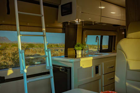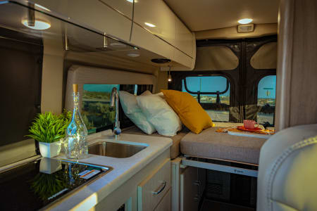 Inside, you’ll find a sleek kitchenette with a glass two-burner gas cooktop, a built-in refrigerator, microwave, stainless steel sink with a cover, and a stylish faucet—everything you need for meals on the go. Stay cozy in all seasons with heating and air conditioning, and enjoy added security and convenience with keyless entry, backup camera, and integrated pest-protectant screens.