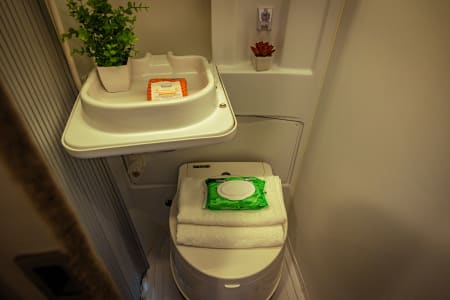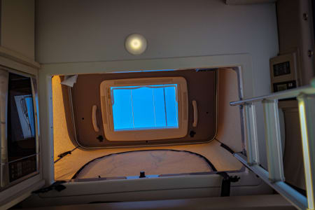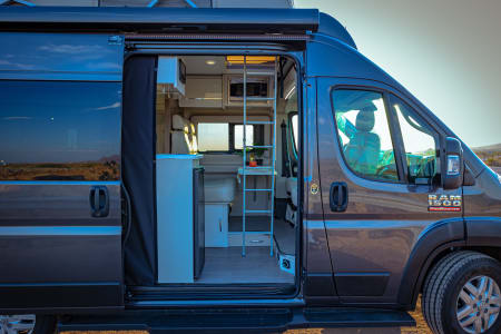 Stacy’s Station is loaded with thoughtful design touches and modern amenities to make your journey smooth and enjoyable. The unique pop-top “sky bunk” sleeps two comfortably with full leg extension—ideal for taller travelers. Below, the main cabin offers a fold-flat sleeping area, accommodating two more adventurers with ease. Whether it’s you and a partner or the whole crew, this van is built to host incredible experiences.