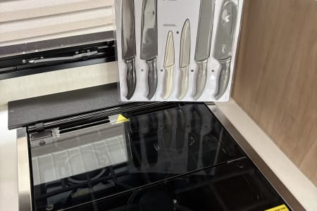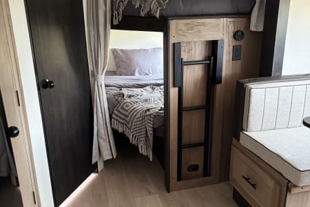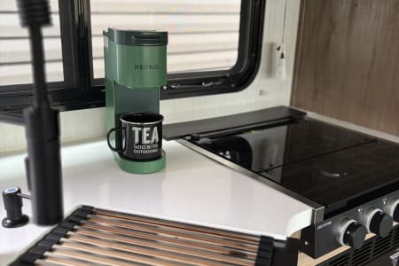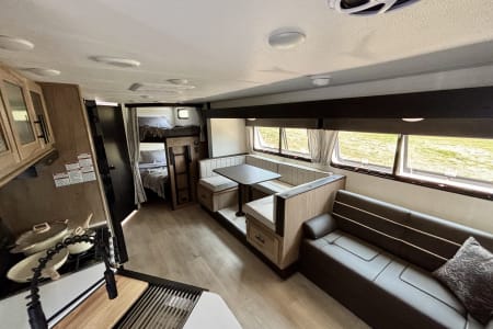 * Outdoor entertainment space: Relax under your 15’ awning in style with a TV wall mount, outdoor speakers with Bluetooth, and an outdoor kitchen that includes a grill, ice cube maker & mini fridge.