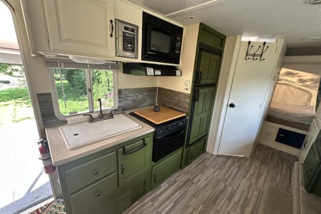 Updated kitchenette with fridge, stovetop, microwave, and sink