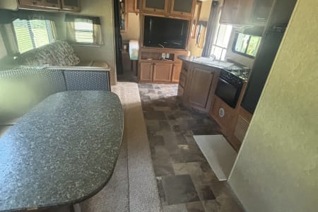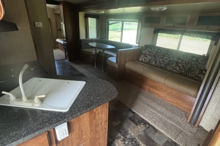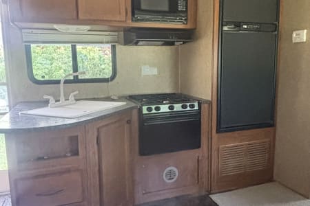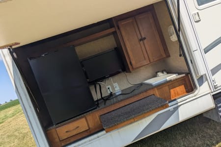 The outside kitchen includes a mini fridge, sink, pull out countertop extension, cabinets, and another tv for enjoying your favorite shows while outside too!