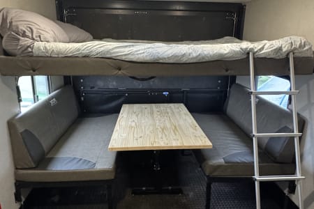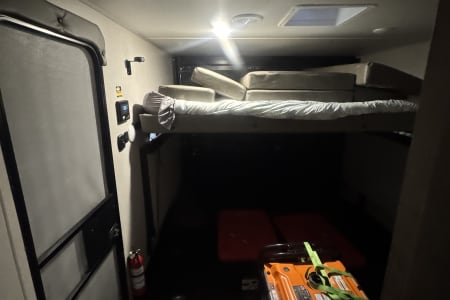 Enjoy some time away in our luxury camper! It offers a queen bed up front with a closet, a queen bunk bed in the rear for the kids to have plenty of room. Rubberized flooring in the rear for easy clean up! The rear door folds out into a patio to really enjoy those cool nights out doors! The sofa does not fold out but each section does recline for maximum comfort. It has a tankless hot water system that works great and plenty of other amenities to offer! Send a message and reach out for much more detail and to get your next mini vacation rolling!